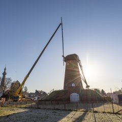 Belangrijke stap in maalvaardige restauratie van windmolen Tongerlo Met een telescoopkraan monteerde molenbouwer Adriaens vandaag de tandwielen, molenstenen, balken en uiteindelijk het dak van de...